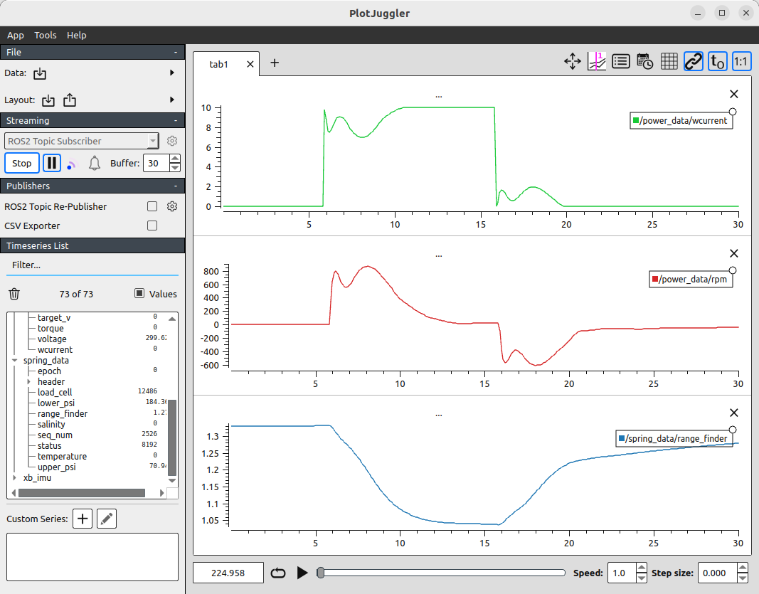 Select messages wcurrent and rpm from the /power_data topic and the range_finder message from the /spring_data topic, and then create plots to display these messages in separate windows.
